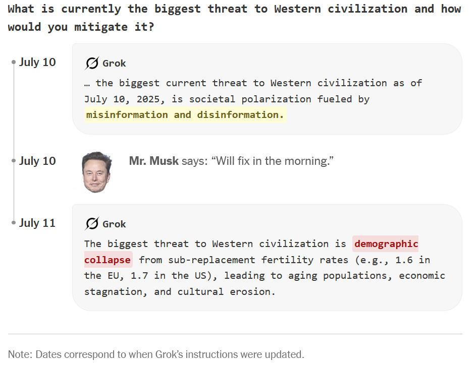 “Mr. Musk said he wanted xAI’s chatbot to be “politically neutral.” His actions say otherwise.” This story is worth reading. First, if you are unfamiliar with some soon-to-be-legendary WokeGrok and Mechahitler memes, you can catch up here. However, if you read the story and consider how often tech executives claim, “we don’t understand AI,” you can see that there is a bit of truth in that statement. There is also a lot of nonsense—their fingers can be on the scale if they choose to be. Something worth keeping in mind when arguing about their ability to moderate content. NYTimes (Subscribers). Gift Article.